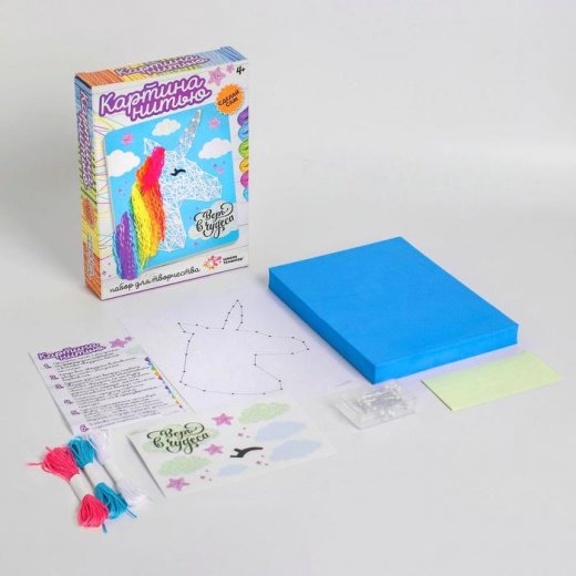 Состав набора: плотная толстая основа из EVA, лист со схемой, нити для натягивания, набор иголок, декор, наклейки.