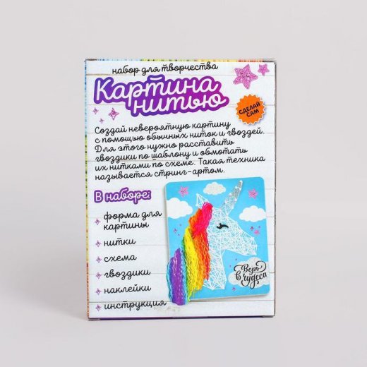 Наборы для творчества в технике стринг-арт — это современный способ декора поверхности. Он заключается в натягивании нитей вокруг гвоздей или иголок по определённой схеме. В результате чего получается интересный рисунок. В наборе представлен вариант техники стринг-арт для детей. Чтобы собрать всё точно, ребёнку обязательно потребуется помощь взрослого.