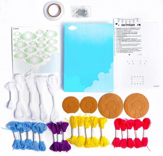 Состав набора: основа из ЭВА для аппликации, фон, схема натягивания нитей, иголки, нити, декор для аппликации, стразы на липком слое.