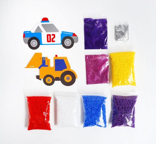 Состав набора: 2 основы для аппликации, пенопластовые шарики разных цветов, блестки разных цветов.