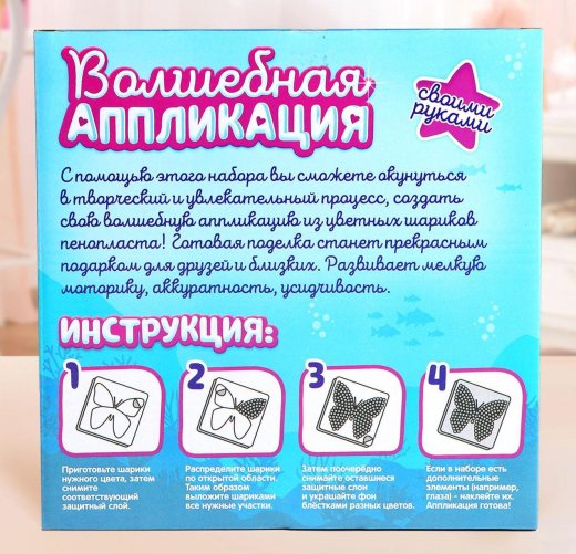 С помощью этого набора вы сможете окунуться в творческий и увлекательный процесс, создать свою волшебную аппликацию из цветных шариков пенопласта! Чтобы изготовить красивую аппликацию, необходимо заранее продумать места, куда хочется положить пенопластовые шарики, а куда блёстки. После чего аккуратно отклеивать верхний слой с нужной части и засыпать на неё шарики или блёстки. Готовое изделие получается очень интересным и необычным.