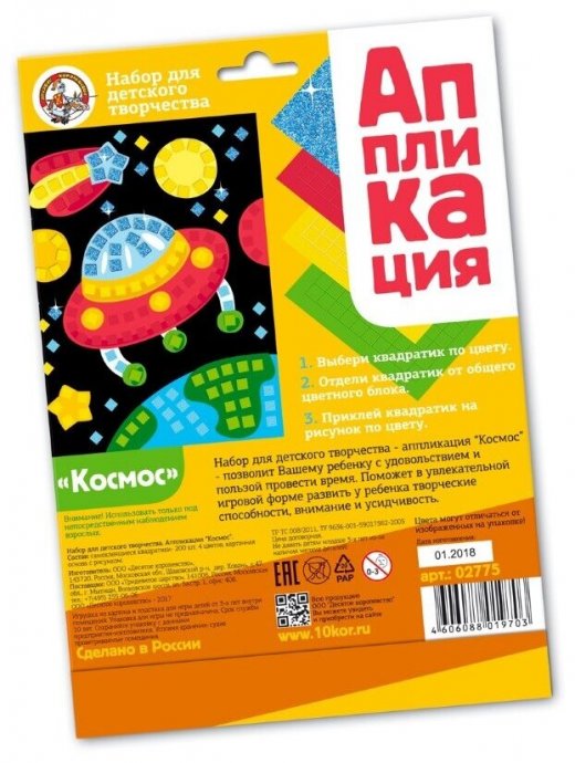 Комплект: картонная основа с красочным изображением; самоклеящиеся квадратики 4 цвета – по 50 шт.