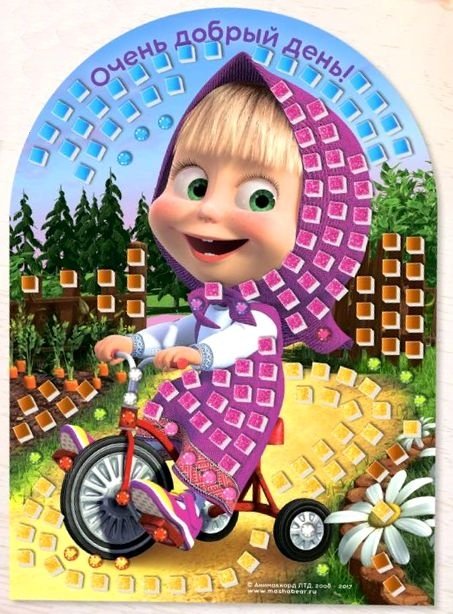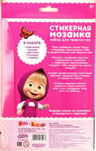 Маша и Медведь приглашают тебя в удивительный мир творчества! Стикерная мозаика — это совершенно новый вид аппликаций. Процесс ее выполнения весьма прост и с ним справится даже совсем юный ребенок. Нужно лишь отделить детали от основы, а затем приклеить их к картонной основе липким слоем, не забудьте клеить по номерам, – и шедевр готов! Такое занятие, несомненно, понравится ребенку, а готовая мозаика приведет его в восторг, ведь она будет сделана своими руками.