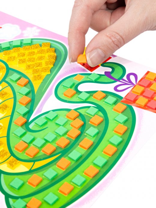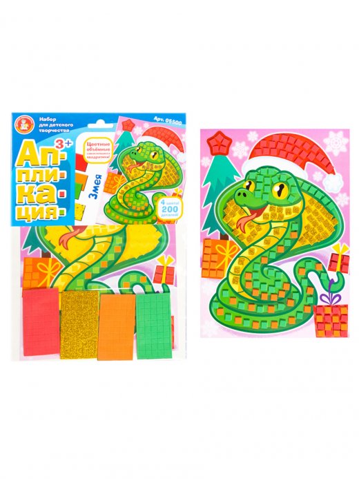 Детская самоклеящаяся аппликация «Змея» с символом нового года обязательно привлечет внимание малыша, а чтобы она стала еще привлекательней, придется приложить старание и усидчивость при наклейке квадратиков. В результате ребенок сделает красивую праздничную открытку.
