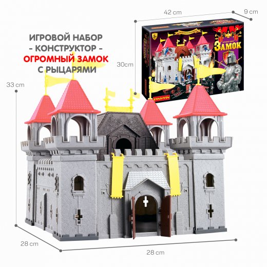 В комплект входят детали для сборки замка, фигурки рыцарей, лошадей и прочие аксессуары. Набор изготовлен из прочных материалов, отвечающих всем стандартам качества и безопасности. Длина, ширина и высота замка в собранном виде 28х28х33 см. Рекомендуемый возраст 3+.