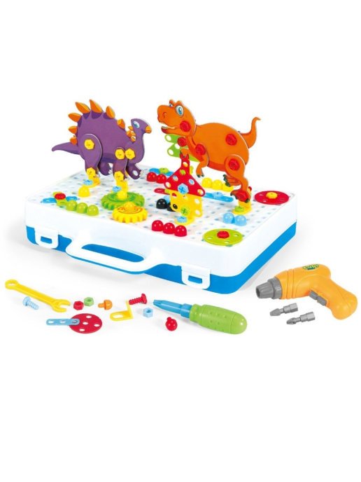 А это не просто мозаика и не просто конструктор это целый сборно-разборный цех. И самое главное это шуруповерт для закручивания и выкручивания шурупов, ведь это мечта всех мальчишек и девчонок. Собирать мозаику особенно полезно, так как это развивает мелкую моторику, позволяет знакомить малыша с цветами и развивает логику. Из геометрических элементов мозаики можно "прикрутить" множество интересных ярких образов, а также собирать вертикальные фигурки, используя специальные крепежи к полю чемоданчика. А еще в комплекте 3 веселые карточки для создания вертикальных фигурок очаровательных Динозавров, они также собираются при помощи дрели и шурупов и крепятся к полю-чемоданчику. Игра развивает мелкую моторику, логику и фантазию.