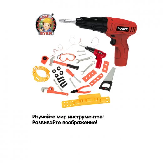В комплекте дрель-шуруповерт с насадками на батарейках, маска, разводной ключ, отвертка со сменными головками, пила, молоток, пассатижи, рулетка, ключ, болты с гайками и аксессуары для хранения инструмента.