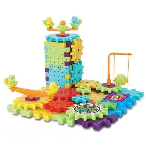 "Дикие шестеренки 81 д." состоит из 81 детали: строительных блоков-пазлов, которые нужно правильно сложить между собой и шестеренок, которые также нужно сложить правильно, чтобы весь механизм "заработал".