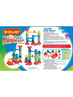 С наборами Bauer Веселые горки можно построить множество вариантов маршрута для скатывающегося вниз шарика, а затем наблюдать результаты своего труда, следя за тем, как шарик следует по заданной траектории. Веселые горки - это игра, развивающая воображение и логику ребенка. Суть игры в правильном построении маршрута для шарика. Некоторые варианты сборки многоуровневого маршрута указаны на упаковке. В игре могут участвовать несколько игроков одновременно, соревнуясь, чей шарик придёт к финишу первым.