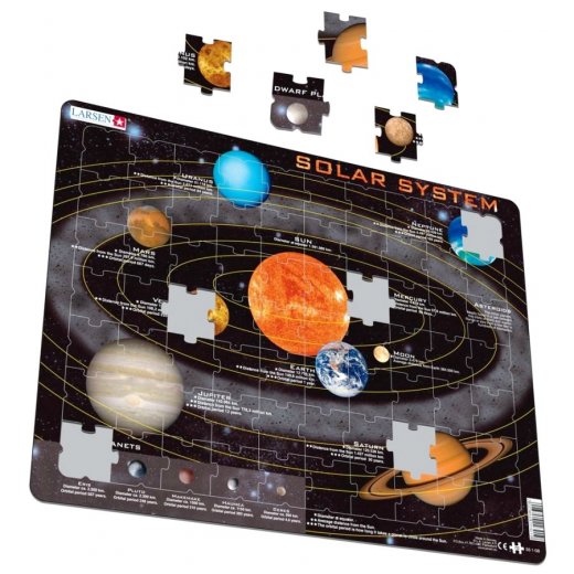 Из 70 элементов пазла дети смогут собрать красочно исполненную карту солнечной системы, которую в дальнейшем можно будет использовать для обучающих занятий. Все надписи на карте на русском языке, поэтому рассматривая карту, дети смогут познакомиться с названиями планет и интересными научными фактами. При составлении картинки необходимо внимательно рассматривать фрагменты изображения и форму деталей.