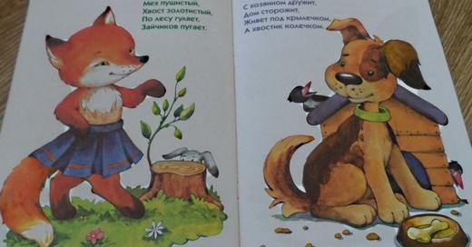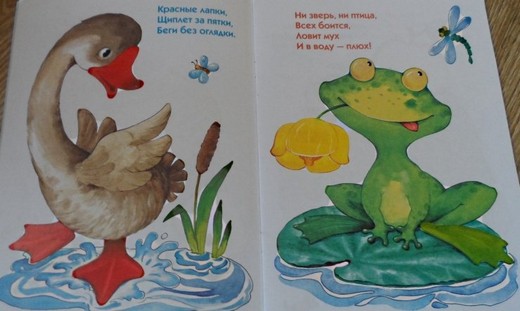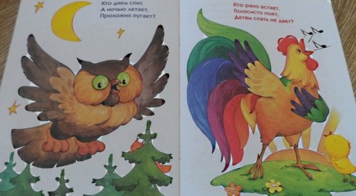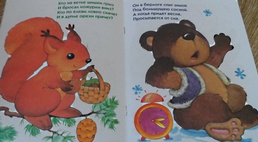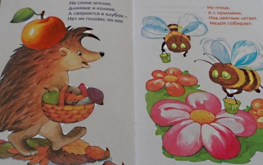 Эта книжка с простыми, понятными годовалому малышу изображениями животных, сопровождаемых стихотворными загадками. Загадки учат видеть в предмете его отдельные, наиболее характерные признаки, находить между ними взаимосвязь и логическим путем определять загаданное. Предлагаемые же задания в этом пособии ребенок сможет выполнить только ближе к 1,5 годам, например, на неокрашенный элемент картинки (шляпка от гриба, шишка, месяц и т.д.) нужно положить такую же картонную деталь из вкладки, найти отличия между двумя похожими картинками и т.п.