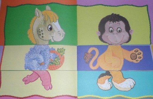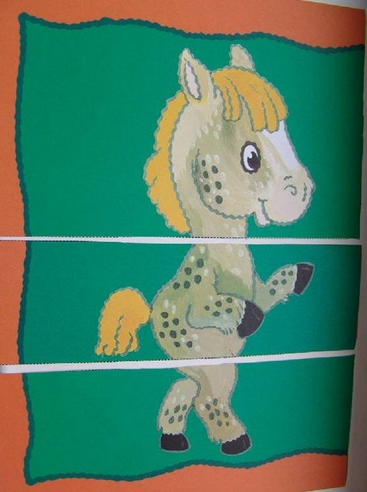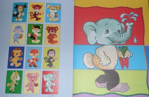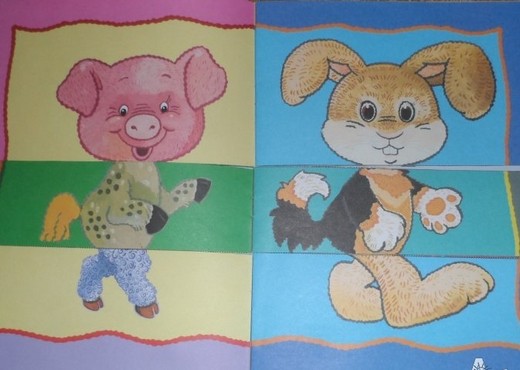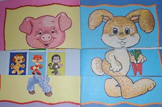 В этой книжке 12 изображений животных, каждое из которых разрезано на три части (голова, туловище, задние ноги). На каждой страничке ребенку нужно собирать животных в единое целое. Книга предназначена для развития зрительного восприятия, мышления и речи ребенка от 1,5 лет и старше.