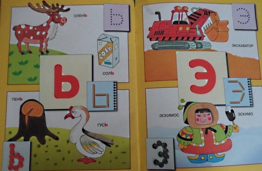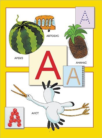 Каждой букве посвящена одна страничка, в центре - сама буква, а вокруг - рисунки тех предметов и животных, которые с нее начинаются.