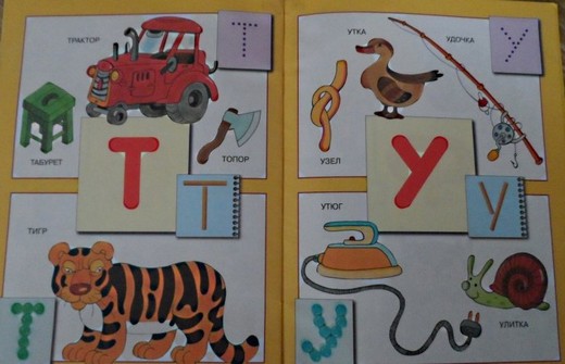 В книге ребенку встретятся красочные картинки с изображением самых разных предметов и животных, начинающихся на тут или иную букву.