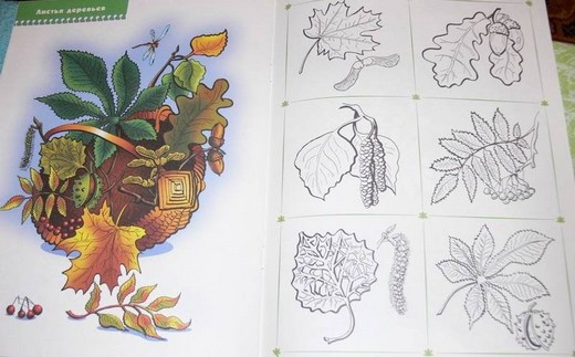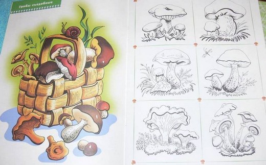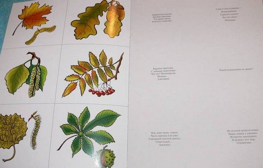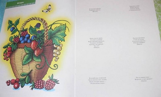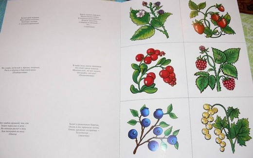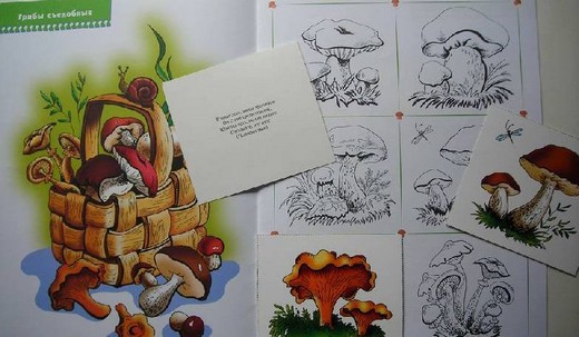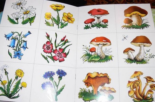 В книге четыре раздела – разворота: грибы, ягоды, цветы и листья. Нужно дополнять картинки разрезанными цветными карточками, на обратной стороне которых имеются загадки. С помощью таких увлекательных игр-занятий, ребенок научится внимательно рассматривать исследуемый объект, выделять его характерные признаки и составляющие части. Раскрашивая картинки, слушая рассказы взрослого о том, какие бывают грибы, ягоды, цветы, листья, разгадывая загадки, малыш почувствует, что наш мир богат, многообразен и прекрасен.