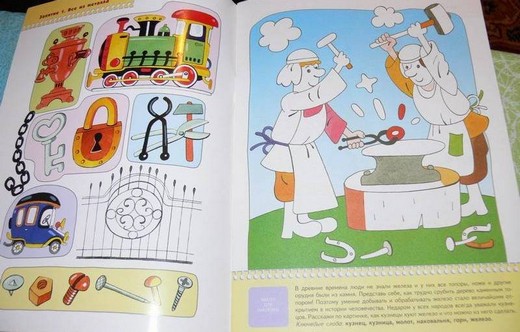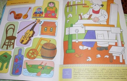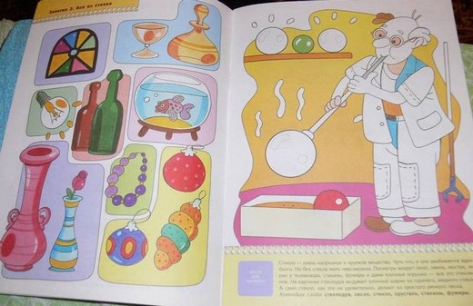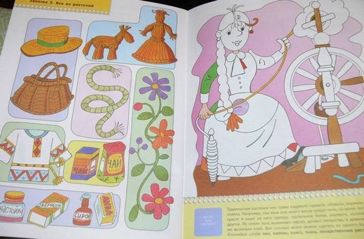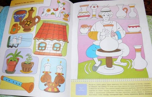Эта книжка ответит на неизменный детей вопрос, из чего сделана та или иная вещь и как она появилась? Ребенок совершит маленькое путешествие в древние времена и познакомится с предметами из глины (вазы, амфоры, горшки, подсвечники, свистульки), из металла (самовар, паровоз, замок, инструменты, машина), из стекла (графин, лампочка, бутылки, бусы, аквариум), из камня (мост, жилые дома, храмы), из растений (шляпа, рубашка, чай, настойки из лекарственных трав, веревка) и из дерева (матрешки, скрипка, мебель, бочка). Ребенок научится различать и называть основные виды материалов, из которых сделаны окружающие его предметы, а закрепить свои знания он может с помощью домино, карточки которого нужно вырезать из картонной вкладки.