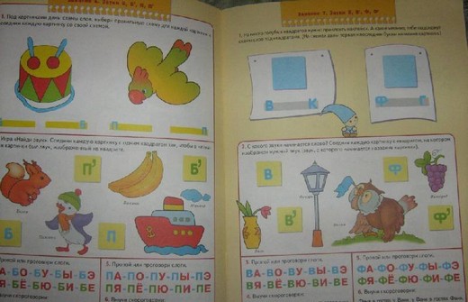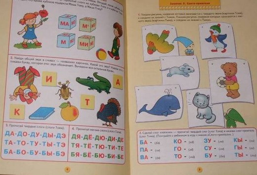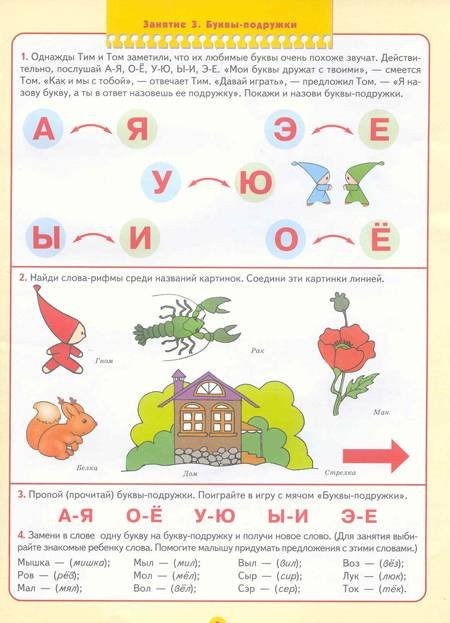 Пособие включает в себя следующие разделы: гласные, буквы-подружки (А-Я, О-Ё, У-Ю, Ы-И, Э-Е), твёрдые и мягкие согласные звуки, слоги-приятели (ВА-ВЯ, ПУ-ПЮ и т.д.) и т.д. Помимо этого, малыш научится: употреблять антонимы для обозначения размера и цвета предмета, пересказывать тексты, составлять рассказы по картинкам. Много радости ребенку доставит игра со звуками и рифмами. И наверняка малышу понравится клеить маленькие симпатичные наклейки, которые он найдет в приложении к пособию.