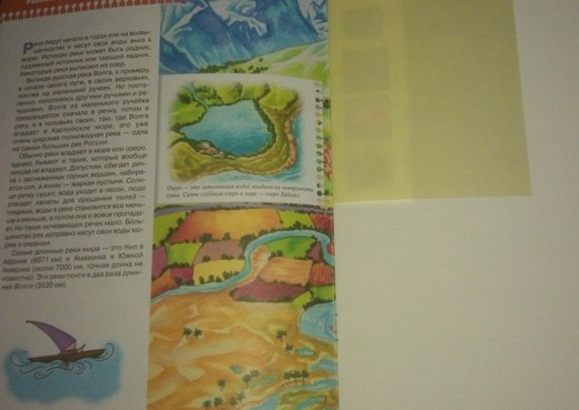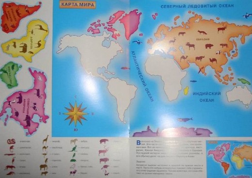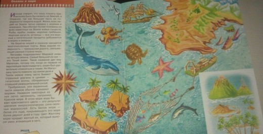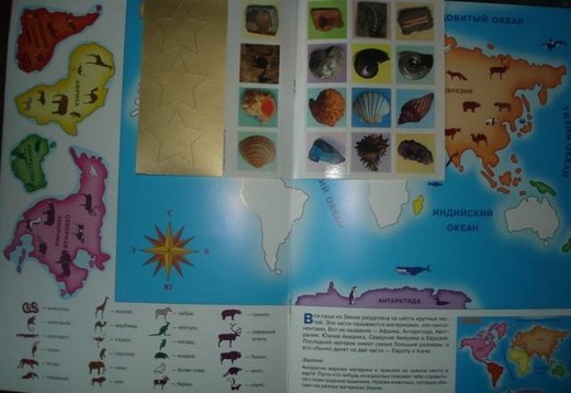 Эта книга - мини-энциклопедия. Материал в ней изложен в виде определений, описаний и фактов. Один разворот – одна тема. Иллюстрация занимает большую часть разворота, остальное - текст. Всего 9 разворотов: наша Земля; океаны и моря; острова и полуострова; горные цепи и вершины; равнины, реки и озера; подземные реки и пещеры; полезные ископаемые; богатства недр; минералы и горные породы. Малыш узнает, что такое атмосфера и почему так важно, чтобы она была чистой, познакомится с изменениями, происходящими на Земле. В увлекательной и доступной форме книга расскажет ему о подземных реках, островах вулканического происхождения и коралловых рифах. Ребенок совершит путешествие в недра Земли и узнает об их богатствах. В середине книги на плотном картоне дана карта мира, на которую нужно наклеить вырезанные материки. На материках нарисованы животные, которые там обитают. А также есть 16 наклеек по теме «География» и три золотые звездочки – призы. Родительская страничка в данной книге отсутствует, да в ней и нет необходимости.