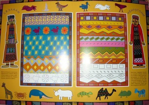 Также в книгу вложена картонная вкладка - панно с изображением декоративных самотканых ковриков и африканских животных.