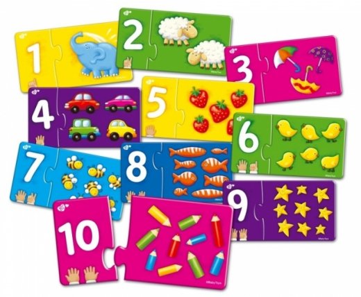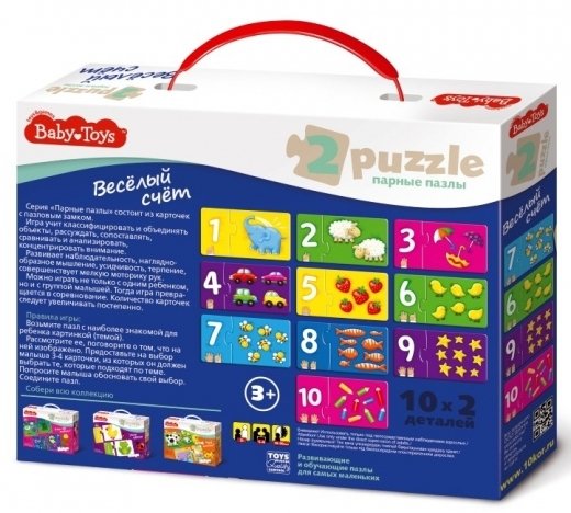 Парные пазлы «Веселый счет» - состоят из карточек с пазловым замком. Вашему малышу будет удобно брать большие детали в руки и самостоятельно собирать, одновременно обучаясь счету от 1 до 10. Задача ребенка правильно собрать пазлы, чтобы цифра на левом элементе совпадала с количеством изображений на правом. Для лучшего понимания и освоения счета на левом элементе под каждой цифрой имеется изображение ручки, где количество разогнутых пальчиков соответствует цифре.