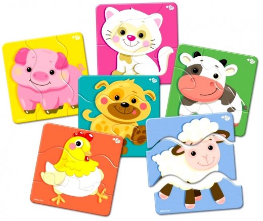 Зиг-заг пазлы Домашние животные – отличная возможность для первого знакомства ребенка с этой увлекательной логической игрой. Вместо привычных пазов малыша ждут зигзагообразные стыки, разобраться с которыми ему покажется гораздо проще, чем с классическими. Набор состоит из 18 элементов, из которых получится собрать 6 красочных картинок с домашними животными. Все они изображены на ярком, цветном фоне и обладают забавным внешним видом, среди них: поросенок, курочка, собачка, кошечка, корова и овечка.