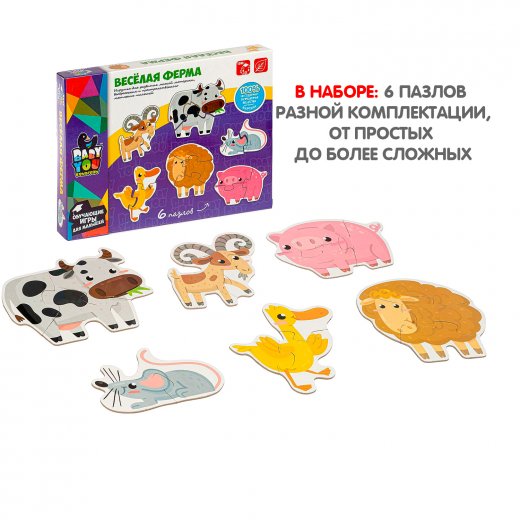 Набор пазлов "ВЕСЕЛАЯ ФЕРМА" серии Baby You от Bondibon подойдут малышам от 1,5 лет. В наборе 6 пазлов в виде домашних животных: корова, свинья, коза, баран, утка и мышь. Пазлы состоят из 2-х, 3-х или 4-х деталей, таким образом сложность выполнения задания увеличивается. Прекрасная игрушка для развития пространственного и логического мышления, памяти и внимания.