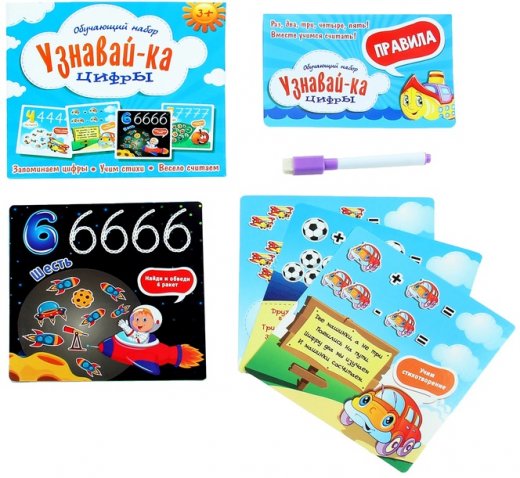 Обучающий набор Узнавай-ка цифры – поможет ребенку с легкость выучить цифры в легкой игровой форме, а именно помогут ему в этом веселые картинки любимых игрушек. В коробке вы найдете яркие карточки – на одной стороне есть задания на изучение цифр, для их выполнения вам понадобится маркер, который входит в набор. А на другой стороне карточек вы обнаружите веселые стихи и простые примеры на сложение и вычитание. Карточки удобны в использовании, маркер легко стирается с ламинированной поверхности, поэтому вы можете играть сколько угодно! Для детей дошкольного возраста преподносить знания лучше всего в игровой форме – это доказано специалистами, ведь именно так ребенок быстрее всего запоминает и утверждает в своей памяти полученную информацию.