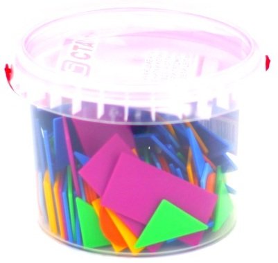 Состав набора: 120 элементов: прямоугольник - 15 штук, квадрат - 15 штук, круг - 15 штук, шестиугольник - 15 штук, треугольник 45° - 30 штук, треугольник 30° - 30 штук.