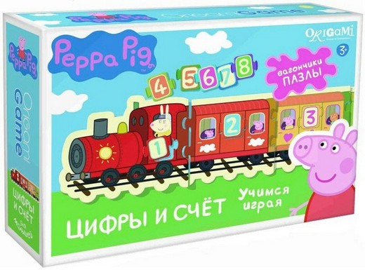 Учимся играя "Цифры и счет Свинка Пеппа"- поможет в увлекательной форме выучить цифры и запомнить их порядок. Игровой набор состоит из 20 картонных карточек с пазловым замком. Цель игры заключается в том, чтобы правильно соединить вагончики соблюдая порядок от 1 до 10 . Каждому вагончику соответствует пазл с цифрой, который в свою очередь соответствует количеству предметов, изображенных на вагоне. В каждом вагончике едут герои мультфильма - свинка Пеппа и ее друзья.
