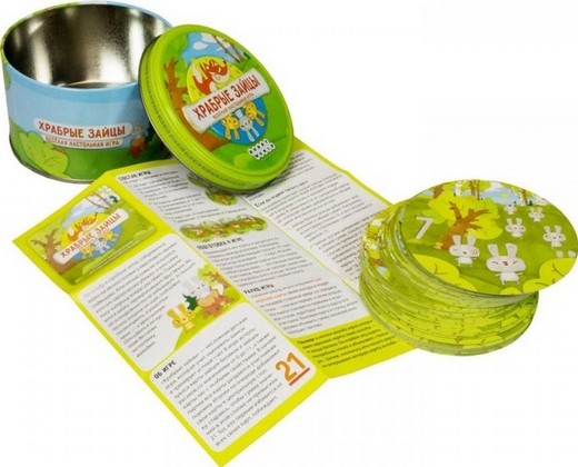 Настольная игра Храбрые зайцы - в простой и увлекательной форме научит детей не только считать, но и оценивать риски и вероятности. Счёт в игре ведётся с помощью карт с номиналом от 0 до 11, при этом присутствуют действия сложения, вычитания и умножения на два. В игре простые правила, очень милый дизайн зверей, приятная цветовая гамма — всё, чтобы и детям, и родителям было интересно и удобно играть.