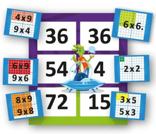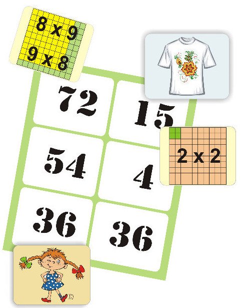 - 36 маленьких карточек из плотного картона размером 5х6,5 см. На одной стороне - геометрическое представление умножения в виде сетки, на другой - картинки с изображением девочки, пирамиды, футболки, цветного круга (для проверки результата умножения)