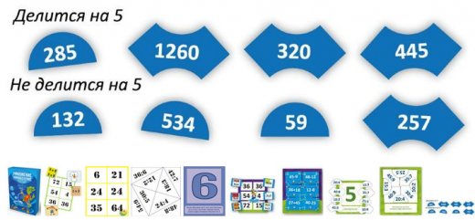 - 64 фигурные карточки из плотного картона. На одной стороне представлены примеры деления, на другой - двух-, трех-, четырехзначные числа, на примере которых можно отрабатывать умение распознавать признаки делимости.