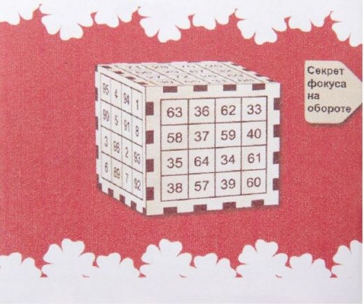 С помощью этого куба можно показать не просто фокус, а удивительное представление. Вы заранее берете любую книгу и определенным образом выписываете оттуда слово на бумажку. Далее, вы отдаете эту бумажку другу и он, не читая её, прячет в карман. С этим кубом вы можете проделать следующий фокус-розыгрыш: предложите сложить числа любого ряда по вертикали или горизонтали на любой грани куба. Пусть он сложит их в уме и не называет результат. Затем, дайте свою книгу и скажите, что первая цифра его суммы обозначает страницу, вторая - строку на этой странице, а третья указывает, какое слово написано у него на бумажке в кармане. Ваш друг удивился вашим способностям? Разгадка фокуса на обратной стороне этикетки. Комплект данного набора содержит детальную инструкцию с описанием игры.