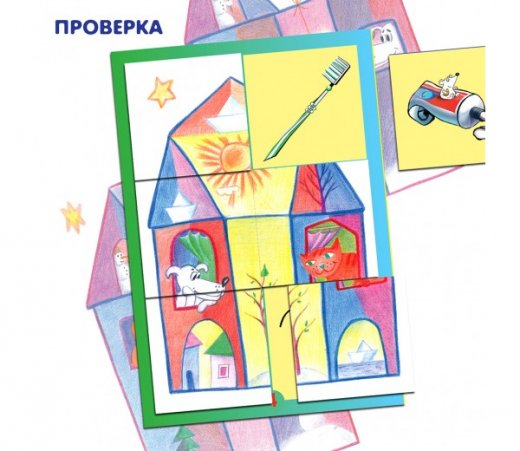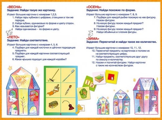 После того, как участники игры собрали свои домики, ведущий предлагает внимательно рассмотреть картинку, назвать время года на ней (уточняя, по каким признакам игроки это определяют) и найти на картинке предмет, изображенный три раза (на каждой карточке - разные предметы).