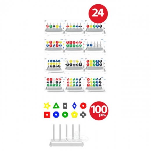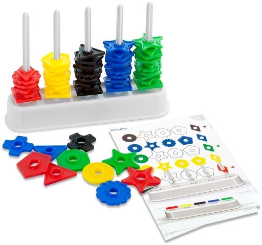 Обучающий набор "Цветной счет 100дет Miniland" представляет собой основу с пятью колоннами, на которые нанизываются 100 плоских деталей, они отличаются формой и цветом. Кроме того, есть 24 карточки с заданиями разными по уровню сложности. Когда малыши освоят эти схемы, педагоги или родители могут придумать для них собственные, нарисовав или распечатав их на бумаге или картоне.