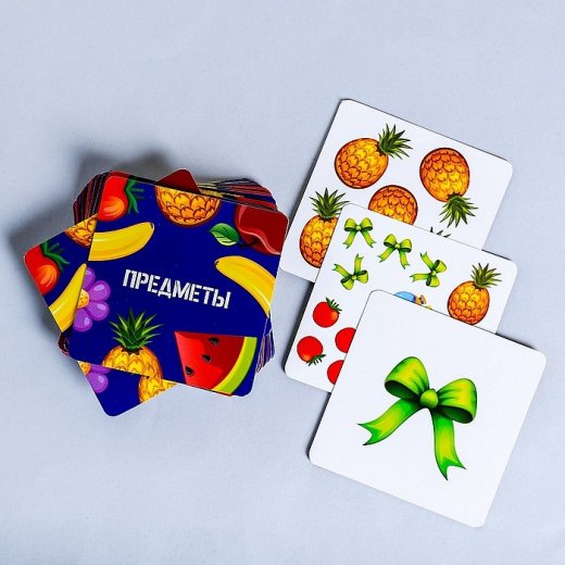 Значит, нужно выложить вокруг этой карточки следующие четыре карты: с 2 рыбками, с 1 яблоком, с 3 цветками и с 4 арбузами. Теперь в получившемся блоке из карт есть по 5 изображений каждого вида (5 рыб, 5 яблок и так далее).