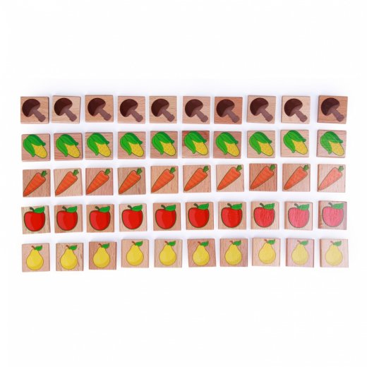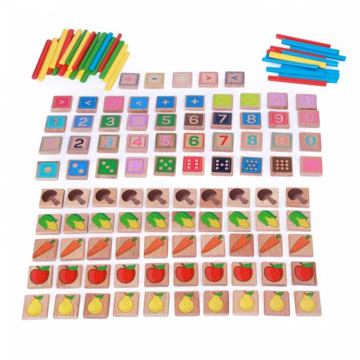 Производитель потрудился создать максимальный простор для изучения математики. Можно складывать фишки с нарисованными овощами, фруктами и грибами, можно пользоваться счетными палочками (40 штук в наборе), а можно изучить квадратики с точками, напоминающие игровой кубик. Все элементы деревянной развивающей игрушки раскрашены в насыщенные цвета и неизменно вызывают интерес у детей. В производстве используется вручную обработанное качественное дерево бука и экологически безопасные краски. Детали не слишком мелкие, так что их сложно проглотить.