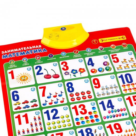 Говорящий плакат "Занимательная математика" - это уникальный и многофункциональный помощник малышу. Он имеет прямоугольную форму и динамик, расположенный в верхней части. Кроме того, здесь также находятся копки управления, которые потребуются для активации различных режимов работы: числа и фигуры, счет и цвета, счет в стихах, сложение, вычитание, больше и меньше, найди цифру, фигуру, экзамен и музыкальная шкатулка.