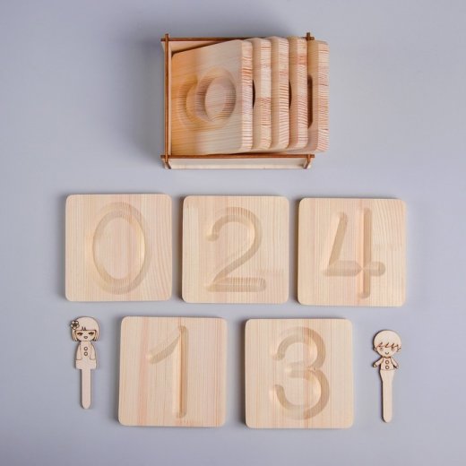 2. Выберите дощечку с цифрой 1, покажите ребенку, как можно обвести цифру пальчиком (помните, что направление движения должно быть сверху вниз). Попросите ребенка повторить ваше движение. Подобным образом обведите цифры на других дощечках.