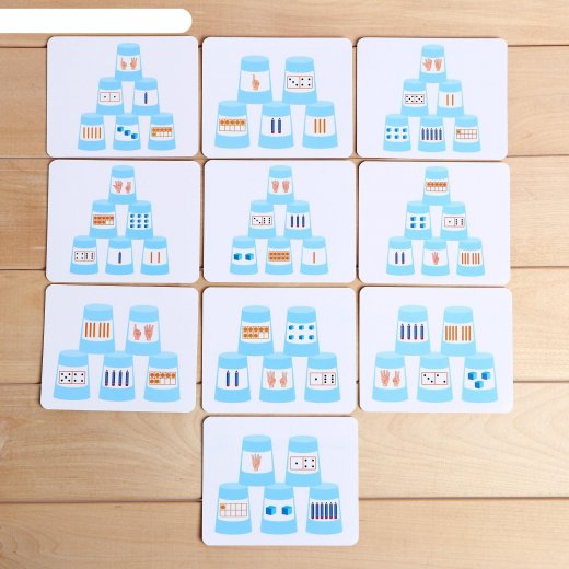 Возьмите карточку и решайте примеры или считайте предметы в задании, чтобы верно поставить стаканчики.