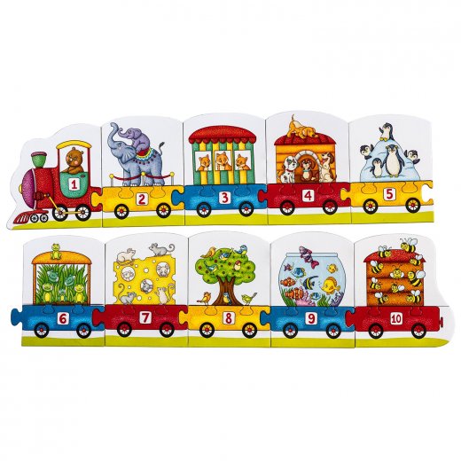 Нужно сложить пазл так, чтобы количество животных и число на вагоне совпадали.