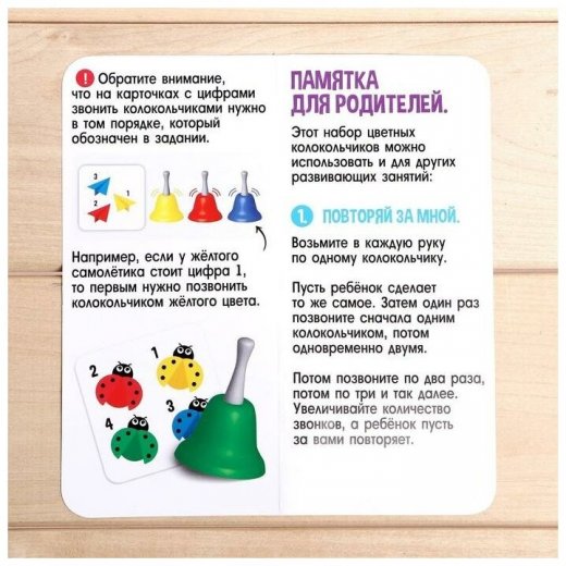 Развивающий набор станет любимой игрушкой вашего ребёнка. В нём малыш обнаружит 4 цветных звонких колокольчика. Они помогут ему запомнить цвета, цифры, научиться считать и решать много полезных заданий с карточек.