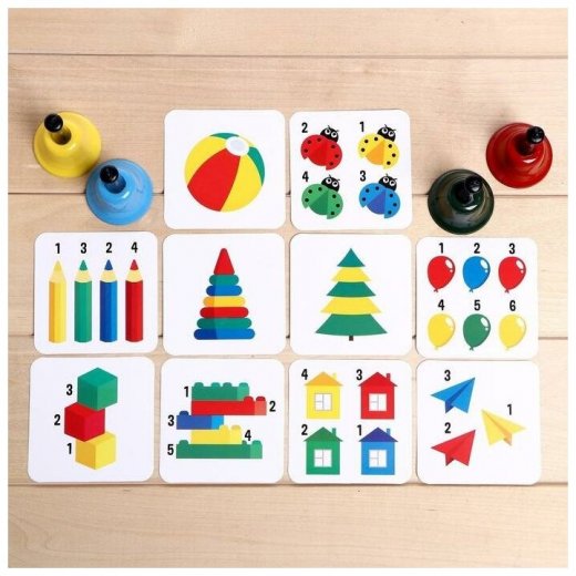 - Рассмотрите карточки с цифрами. Попросите кроху позвонить в колокольчики, соблюдая порядок цифр на карточке и цвет игрушек.