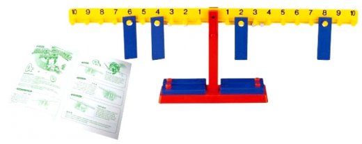 Математические весы GIGO – это конструктор, который представлен в виде 20 деталей, из которых можно собрать незамысловатые весы. Плечо весов выглядит, как линейка с нанесенными на нее с двух сторон цифрами от 1 до 10 и крючками-вешалками под каждой цифрой. На подставке весов имеются штырьки для установки брусков-грузиков. Каждый грузик имеет по отверстию, за которое удобно его подвесить на крючок на плече весов. Принцип игры с конструктором довольно прост: подвесив с одной стороны несколько грузиков, необходимо уравновесить плечо весов, подвесив грузики с другой стороны. Равновесие наступит тогда, когда суммы номеров крючков с подвешенными грузами на обеих сторонах будут равны.