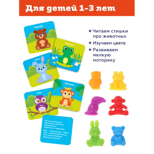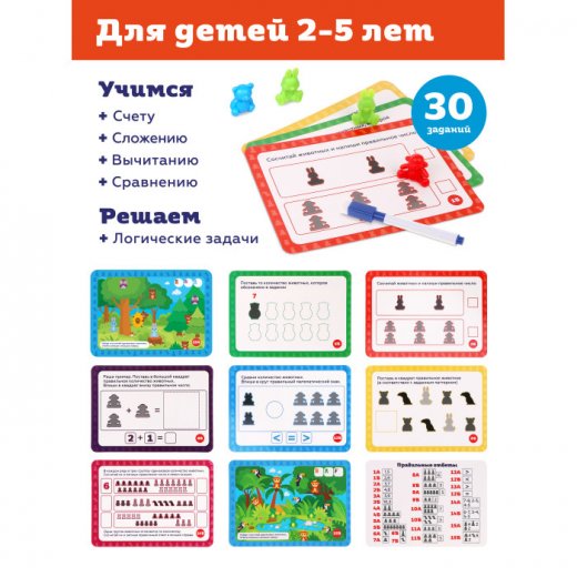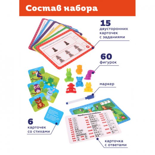Развивающая игра-головоломка «Учимся считать» включает 60 разноцветных фигурок животных, карточки с тридцатью заданиями, карточки с шестью стихами и маркер. Она поможет ребенку в игровой форме изучить цифры, научиться решать простые примеры, а еще выучить стишки про животных. Кроме того, игра прекрасно развивает логическое мышление.