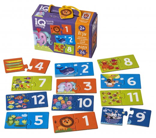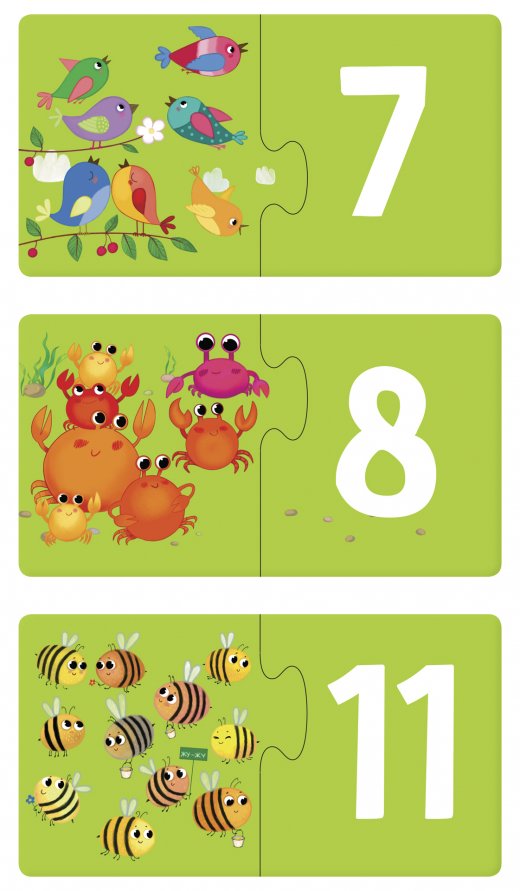 Набор включает 12 пазлов, состоящих из двух частей. Задача игры - составить пару: цифра и соответствующее количество предметов. Ребёнок будет учиться считать, тренировать мелкую моторику и мышление. На отдельном листе-вкладыше дана система заданий для запуска речи. Они позволят устроить интересную игру даже с ещё не говорящими детьми.