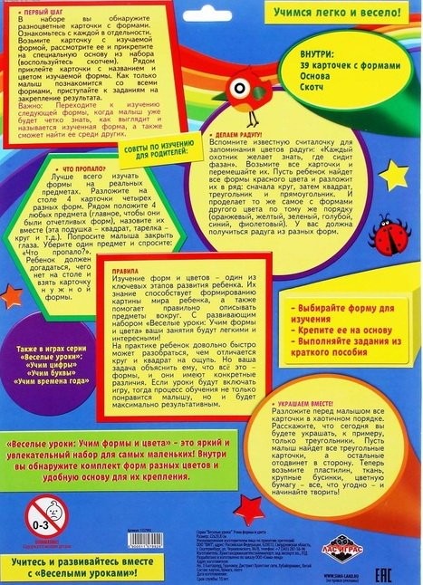 На упаковке специально для родителей есть полезные советы по изучению форм и цветов с малышом.