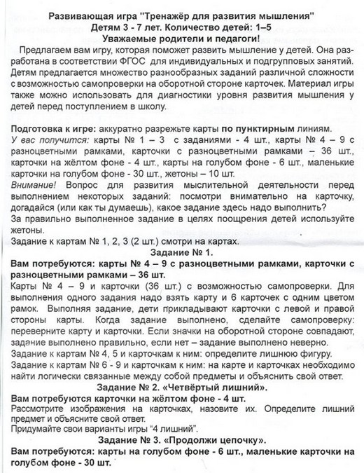 Детям предлагается множество разнообразных заданий различной сложности с возможностью самопроверки на оборотной стороне карточек. Материал игры также можно использовать для диагностики уровня развития мышления у детей перед поступлением в школу.