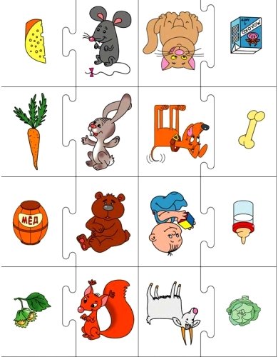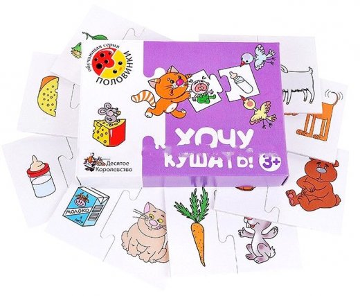 Настольная игра Хочу кушать половинки – это весьма интересное и занимательное занятие для ребенка. В игровой форме малыши познакомятся с вкусовыми предпочтениями некоторых представителей живой природы. Например: заяц и морковка, коза и капуста, мышка и сыр, и так далее.