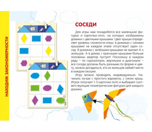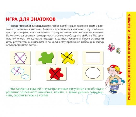 Играть в фигуры можно одному, вдвоем или целой командой. В процессе игры ребенок научится находить предмет по его признакам, подмечать сходства предметов, находить исключения и закономерности, разовьет зрительную память и внимание.